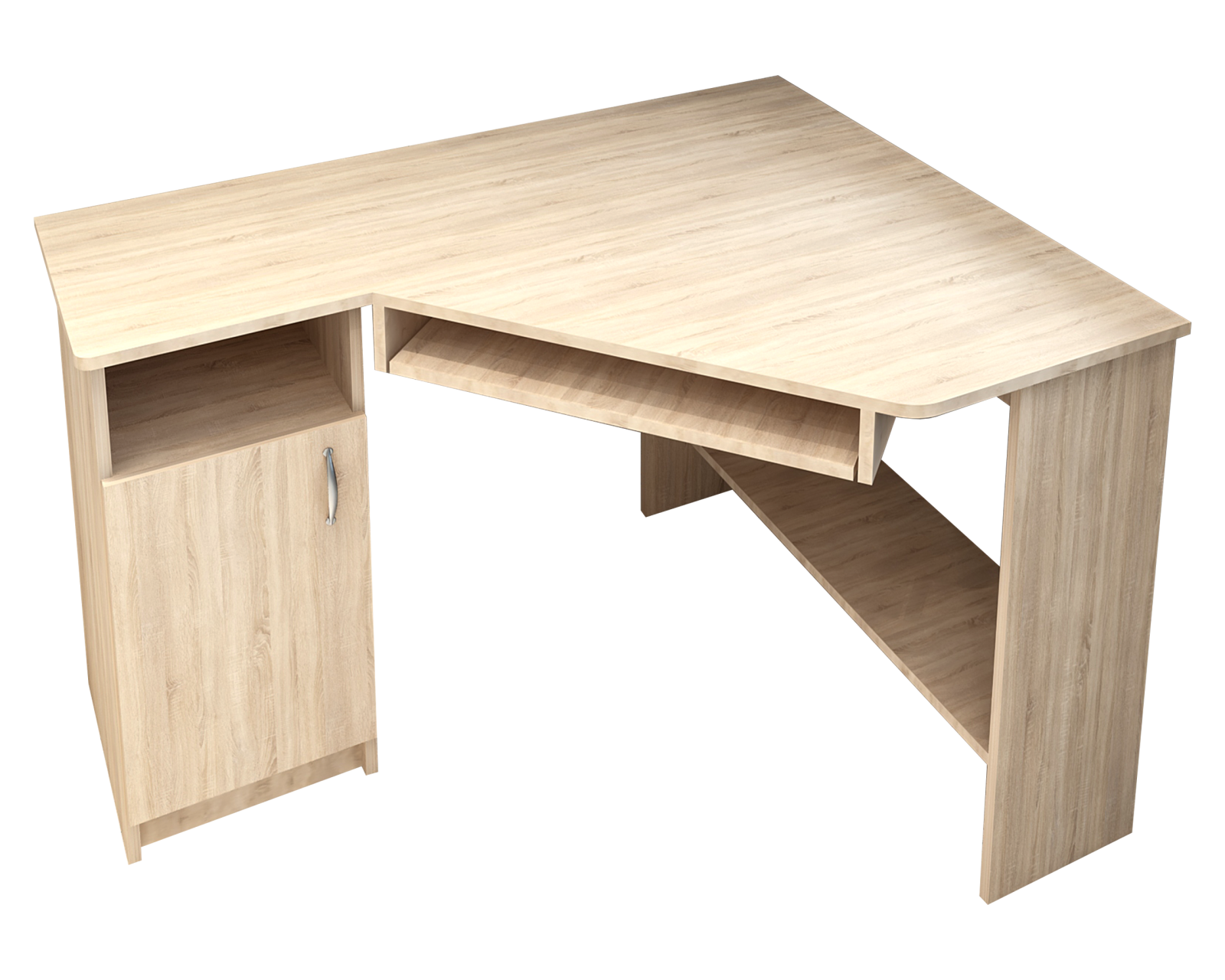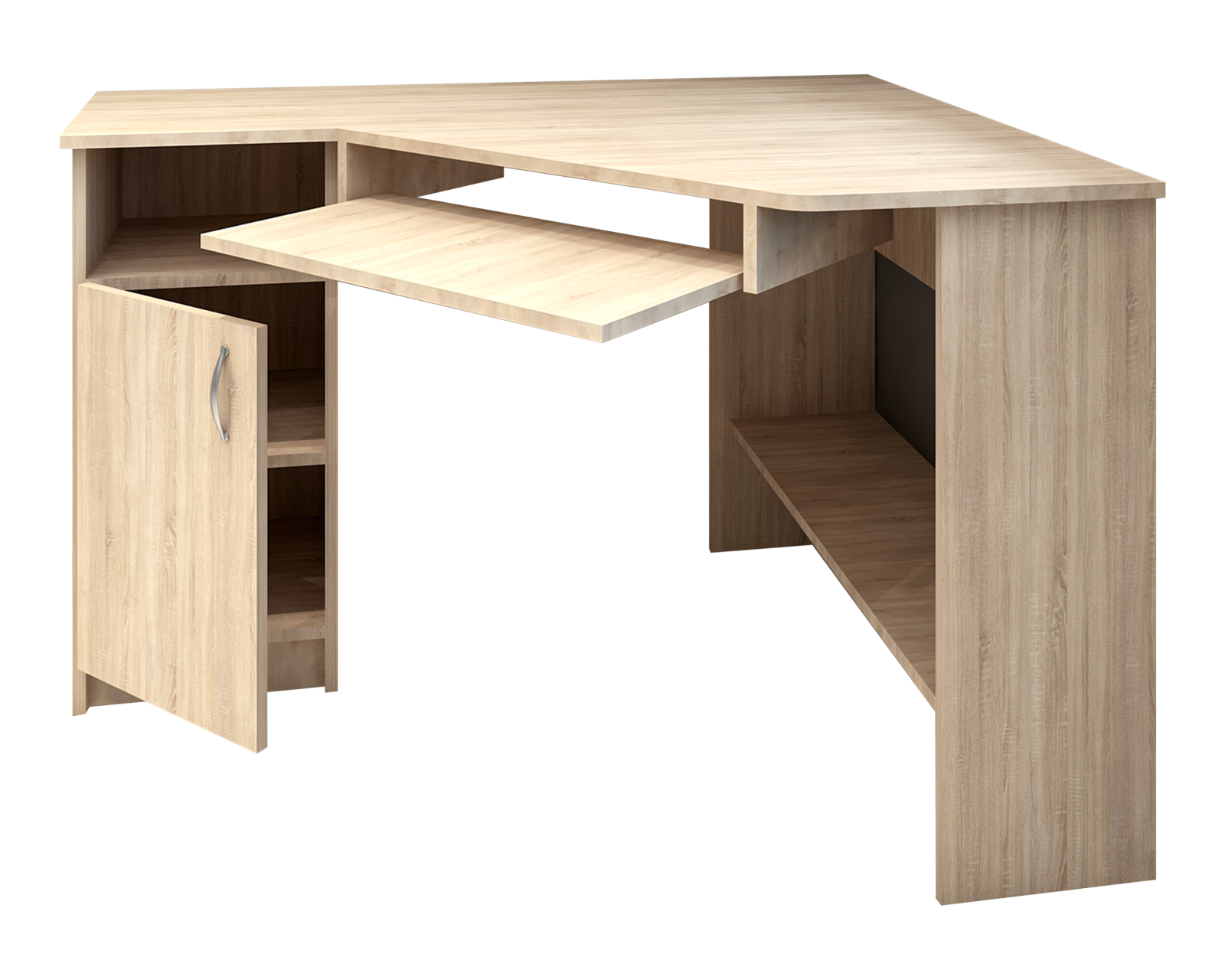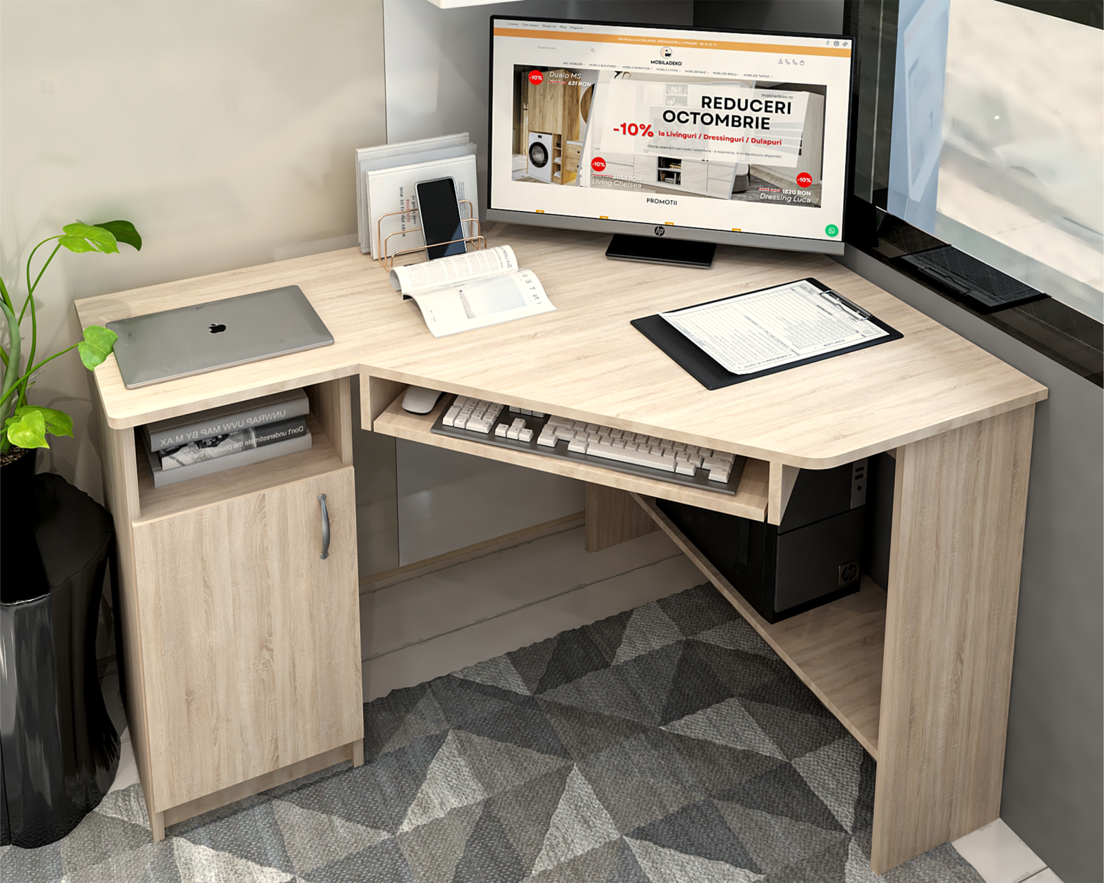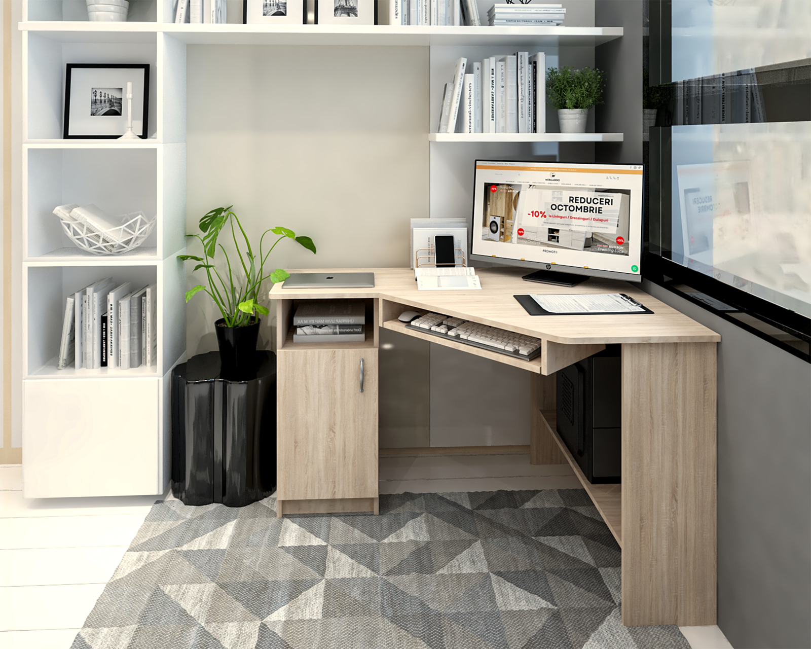 Biroul SU 14 este un birou pe colt, prevazut, pe latura din stanga ( lungime =120cm) este prevazuta cu 1 corp cu 3 rafturi si 1 usa. Latura din partea dreapta ( lungime 90cm ),cu suport glisant pentru tastatura si un raft depozitare in partea inferioara.