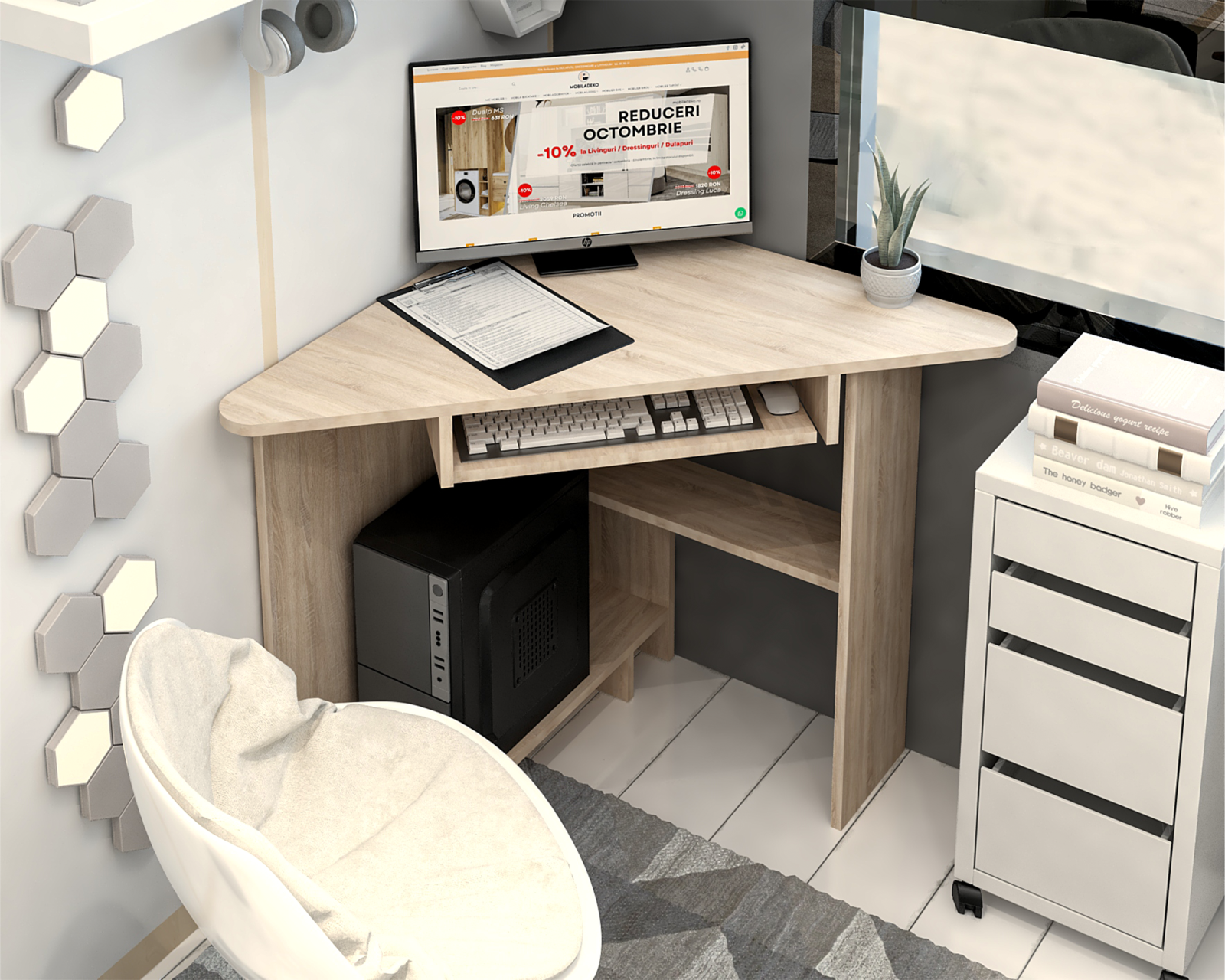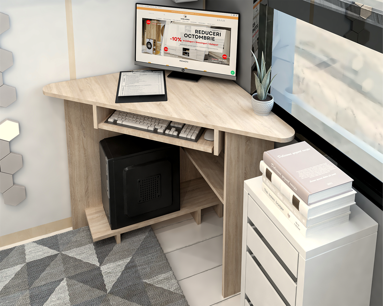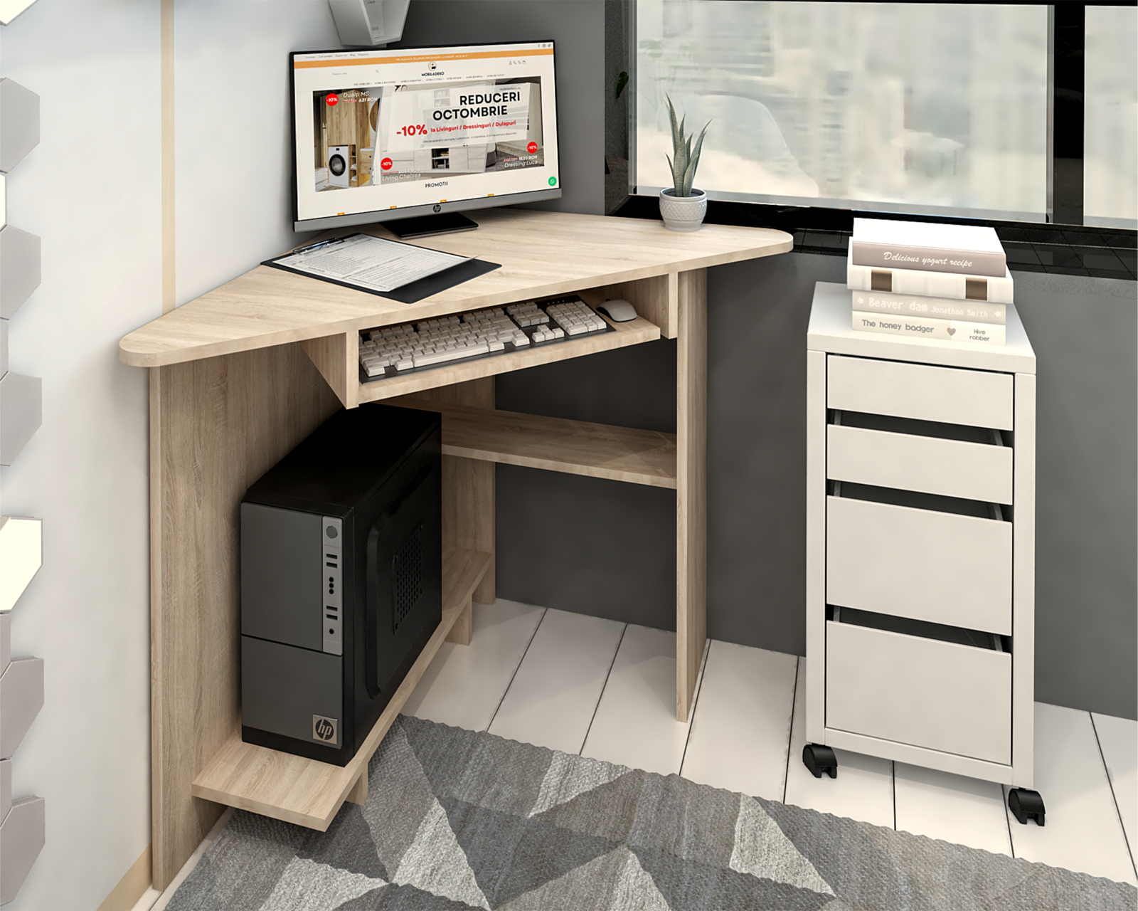 Biroul SU 15 este un birou pe colt, prevazut cu suport glisant pentru tastatura, suport pentru unitate si un raft depozitare in partea inferioara.