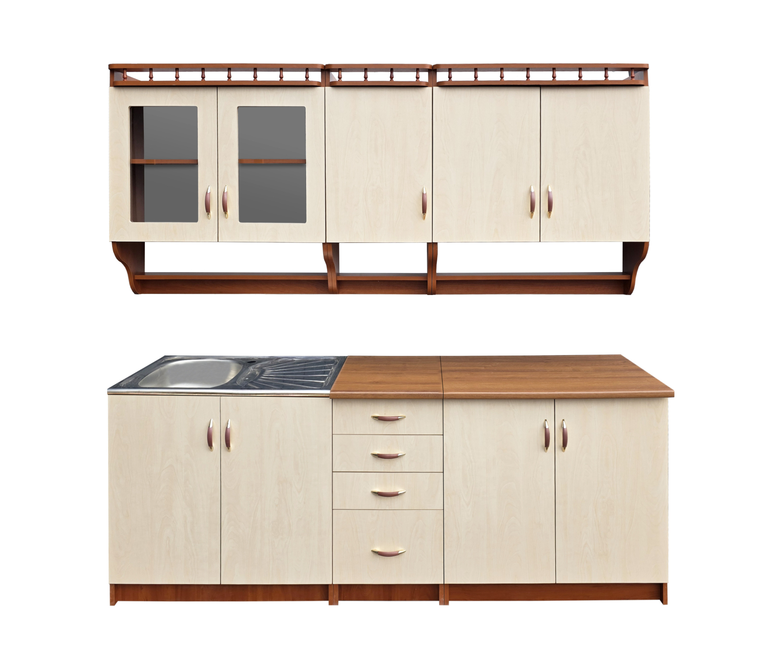 Set mobilier bucătărie cu structură practică și compartimentare eficientă, ideal pentru organizarea optimă a spațiului. Configurație completă cu corpuri inferioare și superioare, plus blat inclus. Chiuveta este doar pentru prezentare și nu este inclusă.