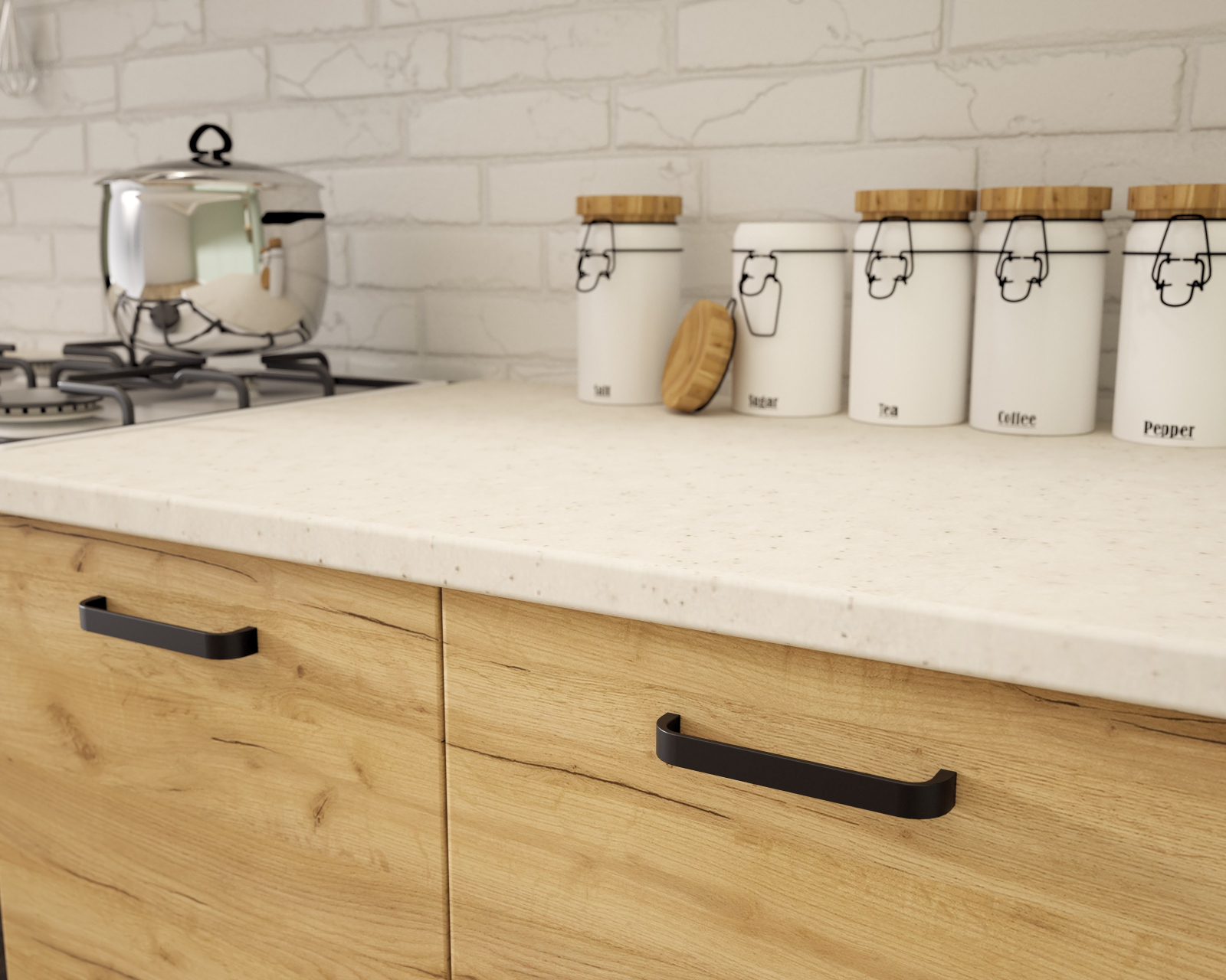 Set mobilier bucatarie modern, configuratie practica, potrivita pentru spatii medii.