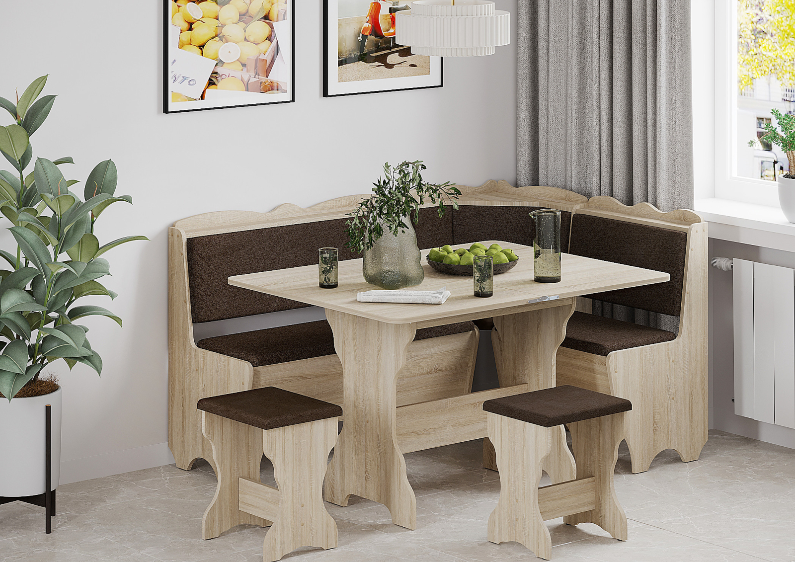 Set colțar Rodos, cu masă extensibilă și 2 tabureți, soluție practică, ideală pentru economisirea spațiului. Setul oferă confort, funcționalitate și spații de depozitare utile, fiind potrivit pentru utilizare zilnică.