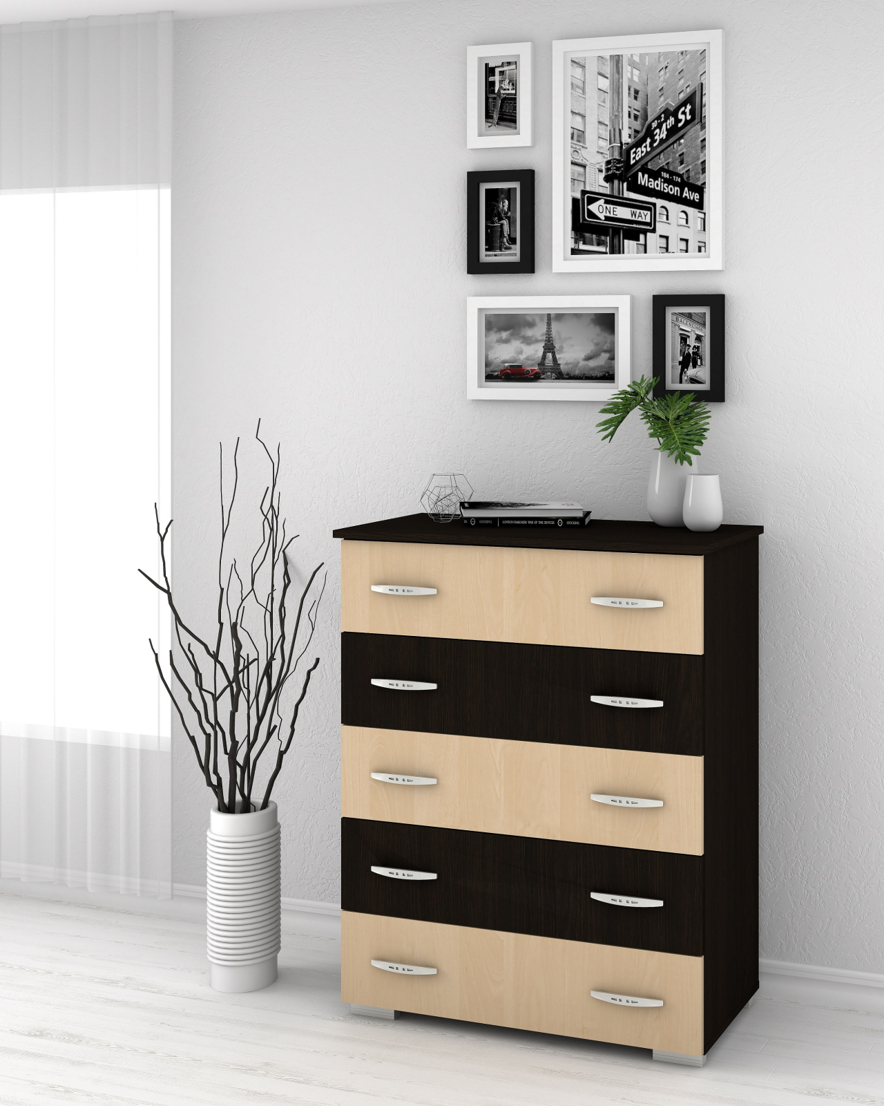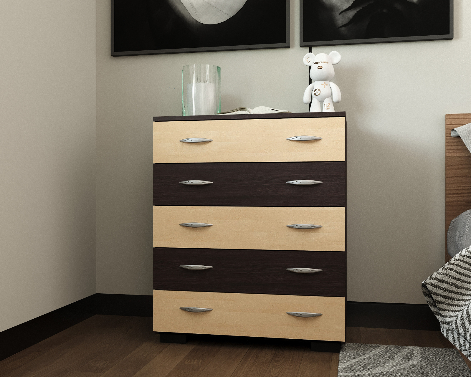 Comodă pentru dormitor, cu design modern, prevăzută cu 5 sertare pentru depozitare eficientă.