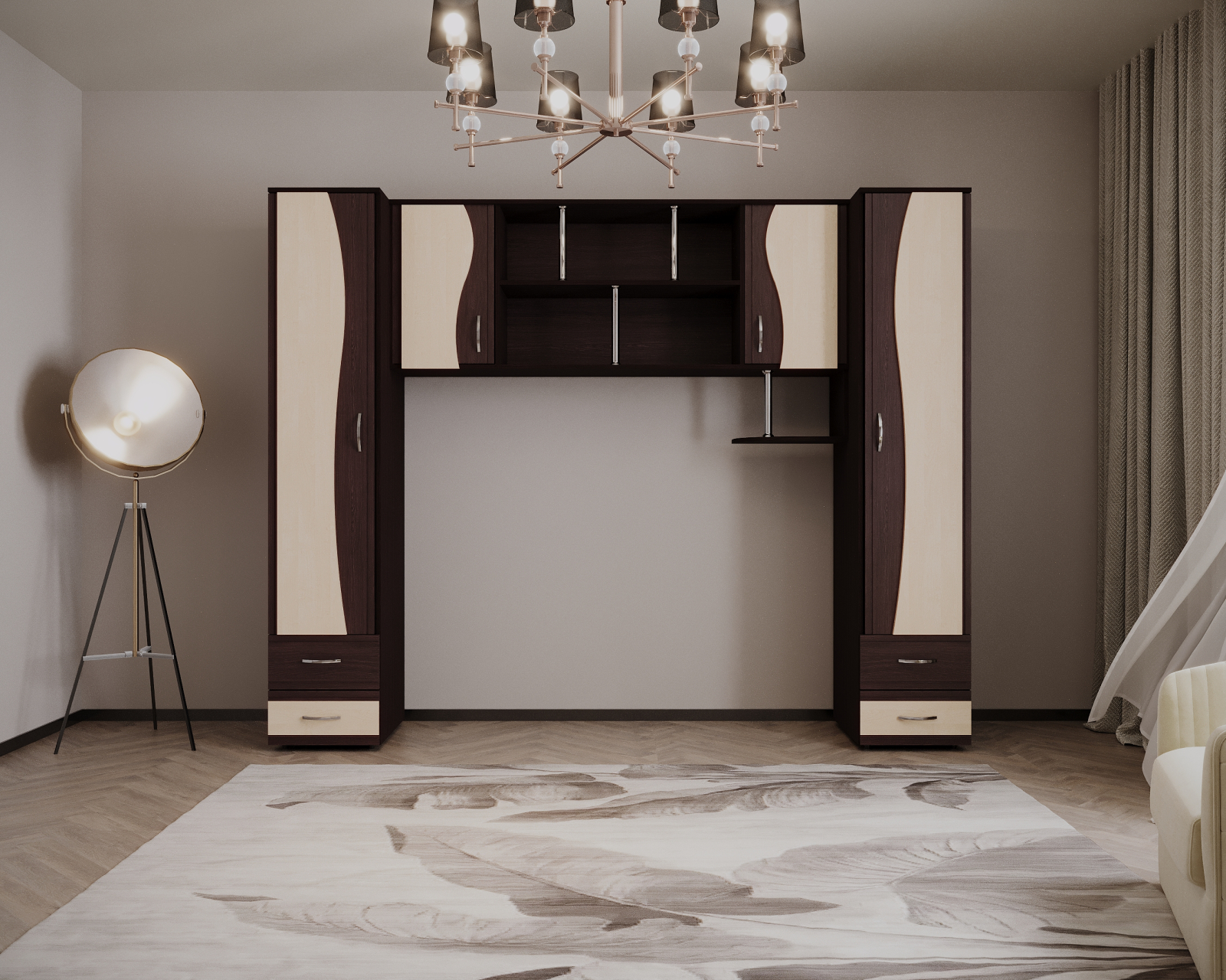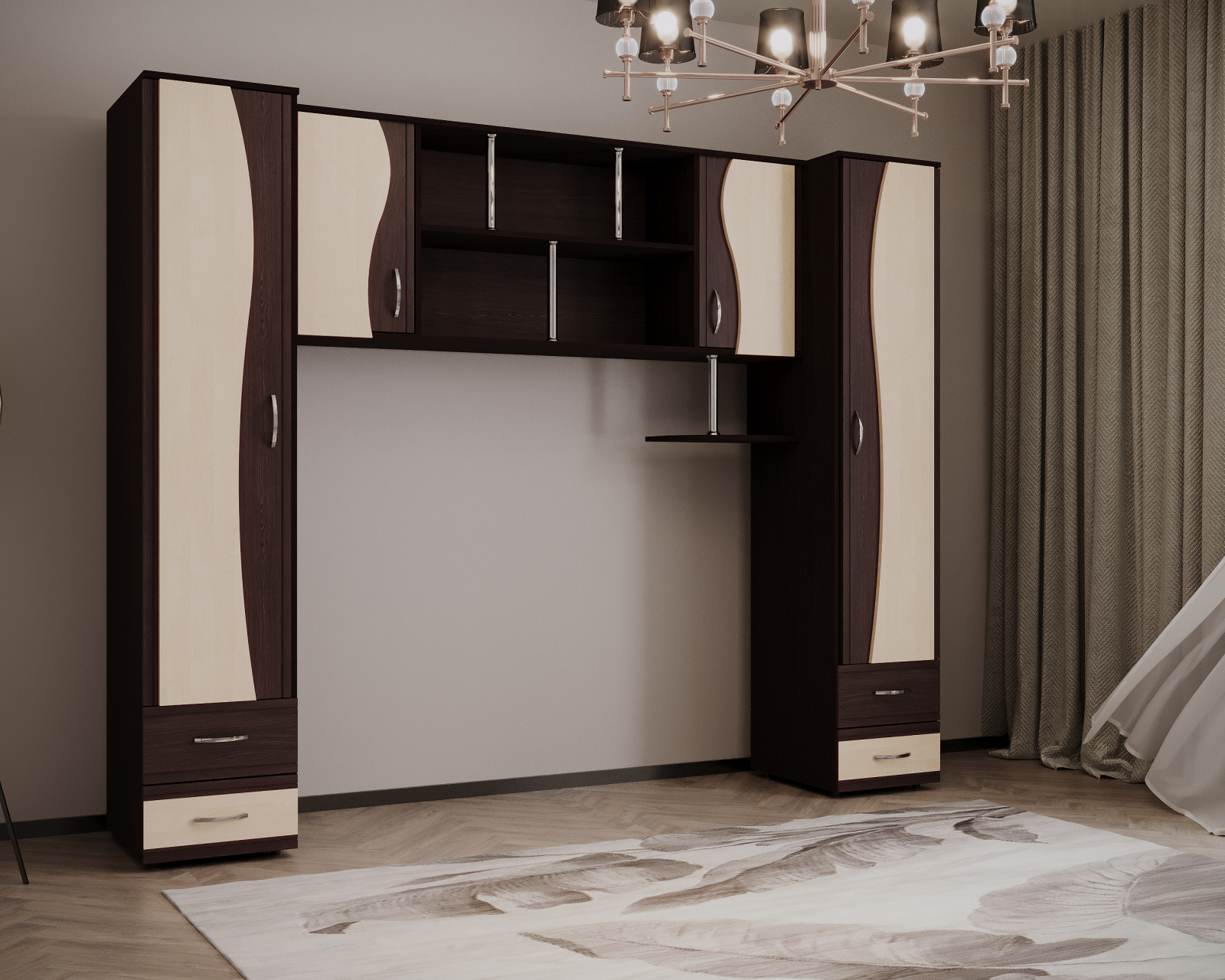 Set mobilier dormitor, realizat din PAL melaminat, cu design contemporan și compartimentare practică, potrivit pentru dormitor.