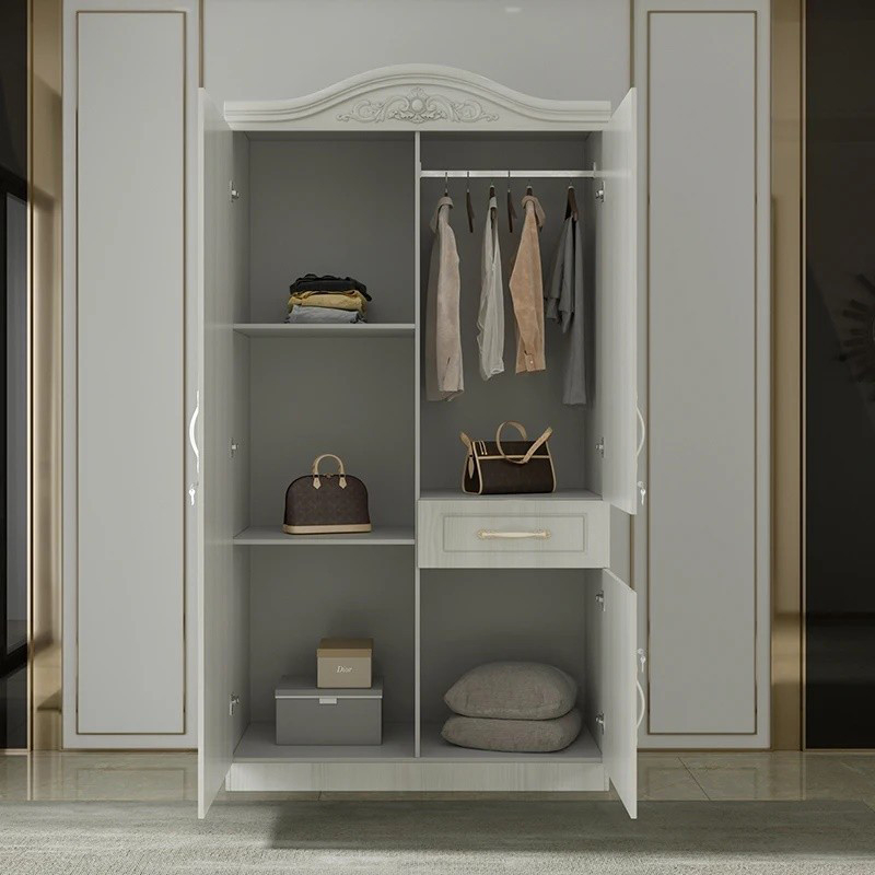 Dulap pentru dormitor sau hol, realizat din PAL melaminat si MDF infoliat, cu design modern si compartimentare practica. Este prevazut cu rafturi, bara pentru haine si sertare, oferind spatiu eficient pentru depozitare.