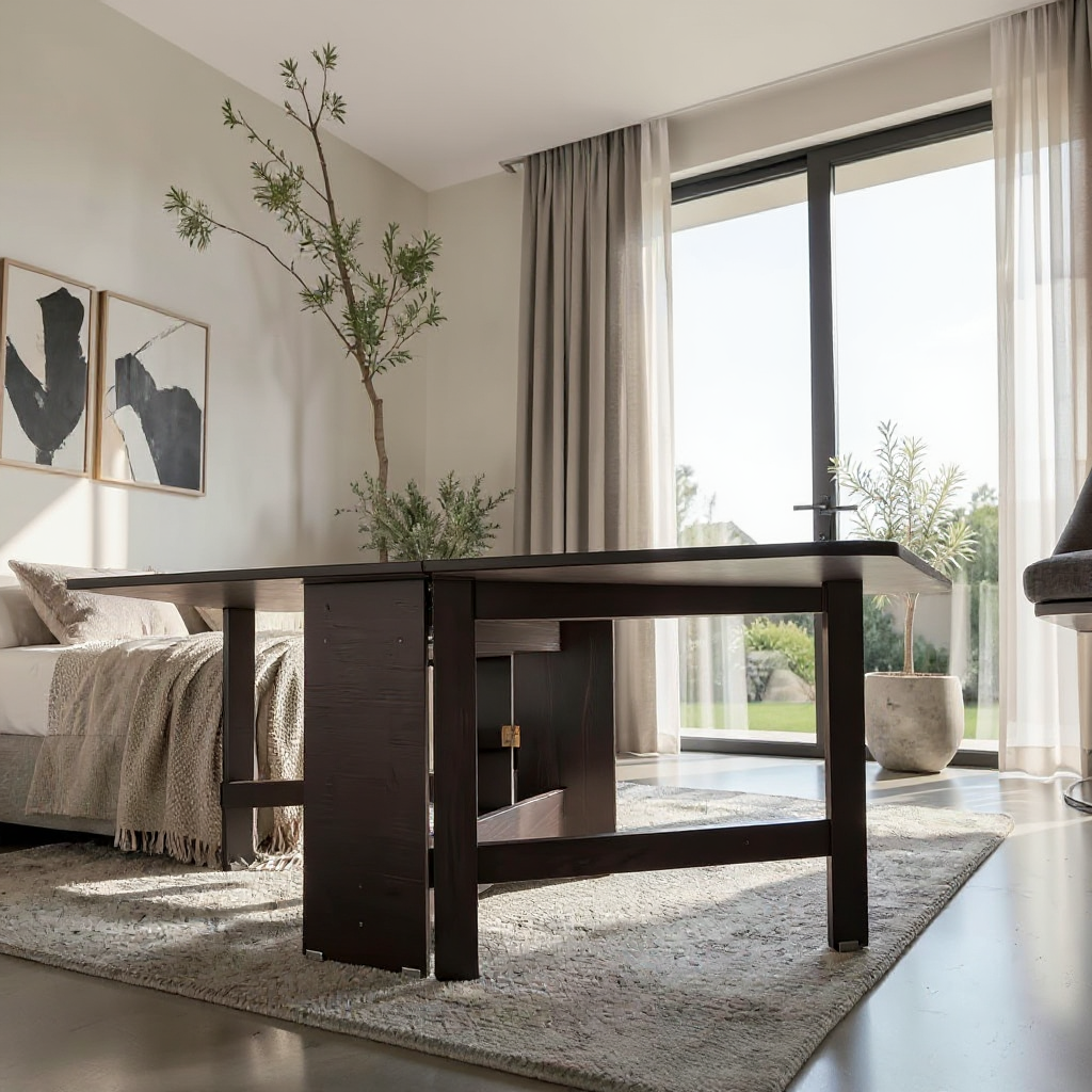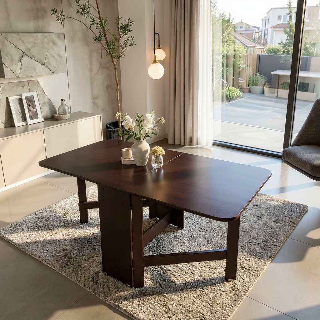 Masă pliantă cu design contemporan, realizată din pal melaminat, ideală pentru bucătărie sau living. Dimensiunea mesei poate fi ajustată ușor prin ridicarea uneia sau a ambelor părți laterale, în funcție de necesități. Cele două părți sunt susținute de un cadru din pal, care se rotește facil datorită balamalelor integrate, oferind stabilitate și funcționalitate sporită.