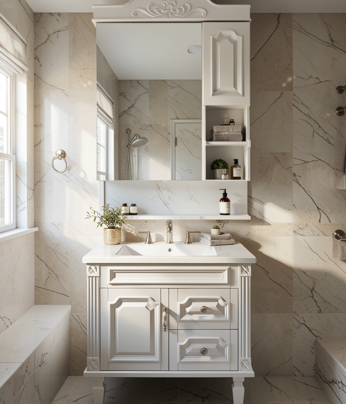 Set mobilier pentru baie 797, cu design modern și finisaj elegant Alb/Aur, conceput pentru a oferi funcționalitate optimă și organizare eficientă a spațiului. Include mască cu lavoar, oglindă cu corp lateral și poliță.