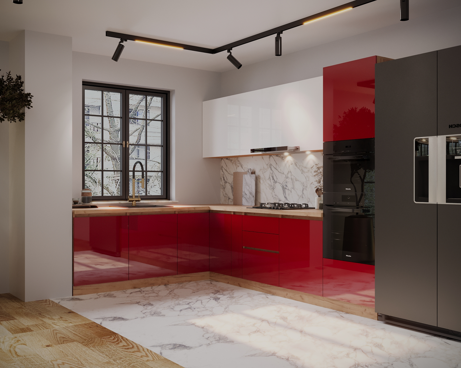 Set de mobilier pentru bucătărie, realizat din PAL melaminat și MDF lucios, cu design modern și configurație pe două laturi, conceput pentru funcționalitate avansată și organizare eficientă.