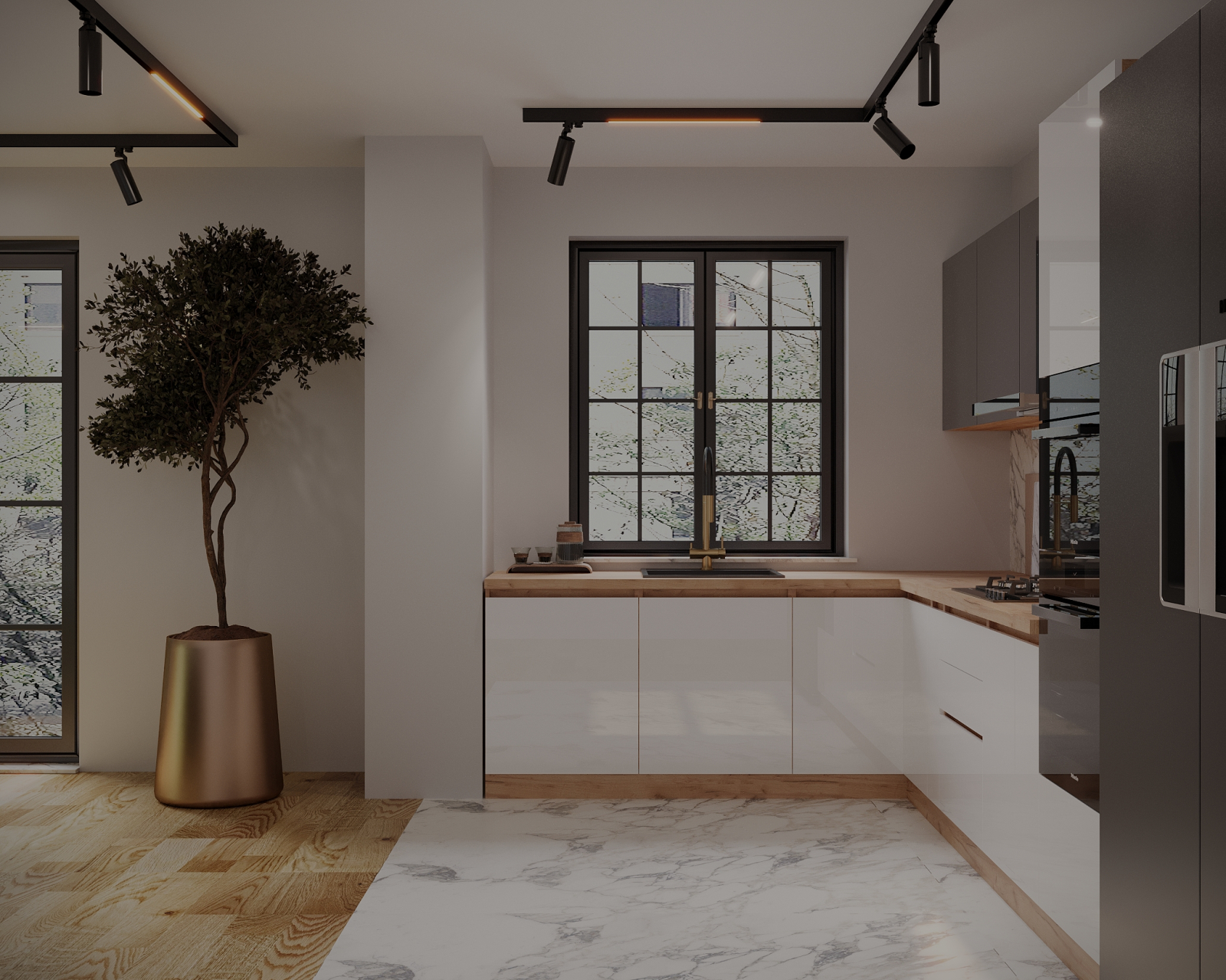 Set de mobilier pentru bucătărie, realizat din PAL melaminat și MDF, cu design modern și configurație pe două laturi, conceput pentru funcționalitate avansată și organizare eficientă.