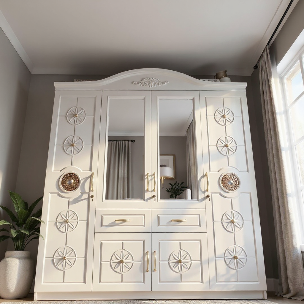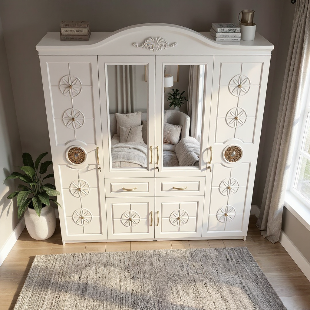 Dulap modern, conceput pentru organizare eficientă în dormitor sau hol, realizat cu corp din pal melaminat alb și fronturi din MDF. Compartimentarea practică include rafturi pentru depozitare, bară pentru haine și sertare cu sistem de glisare metalic, oferind funcționalitate ridicată și un aspect curat.