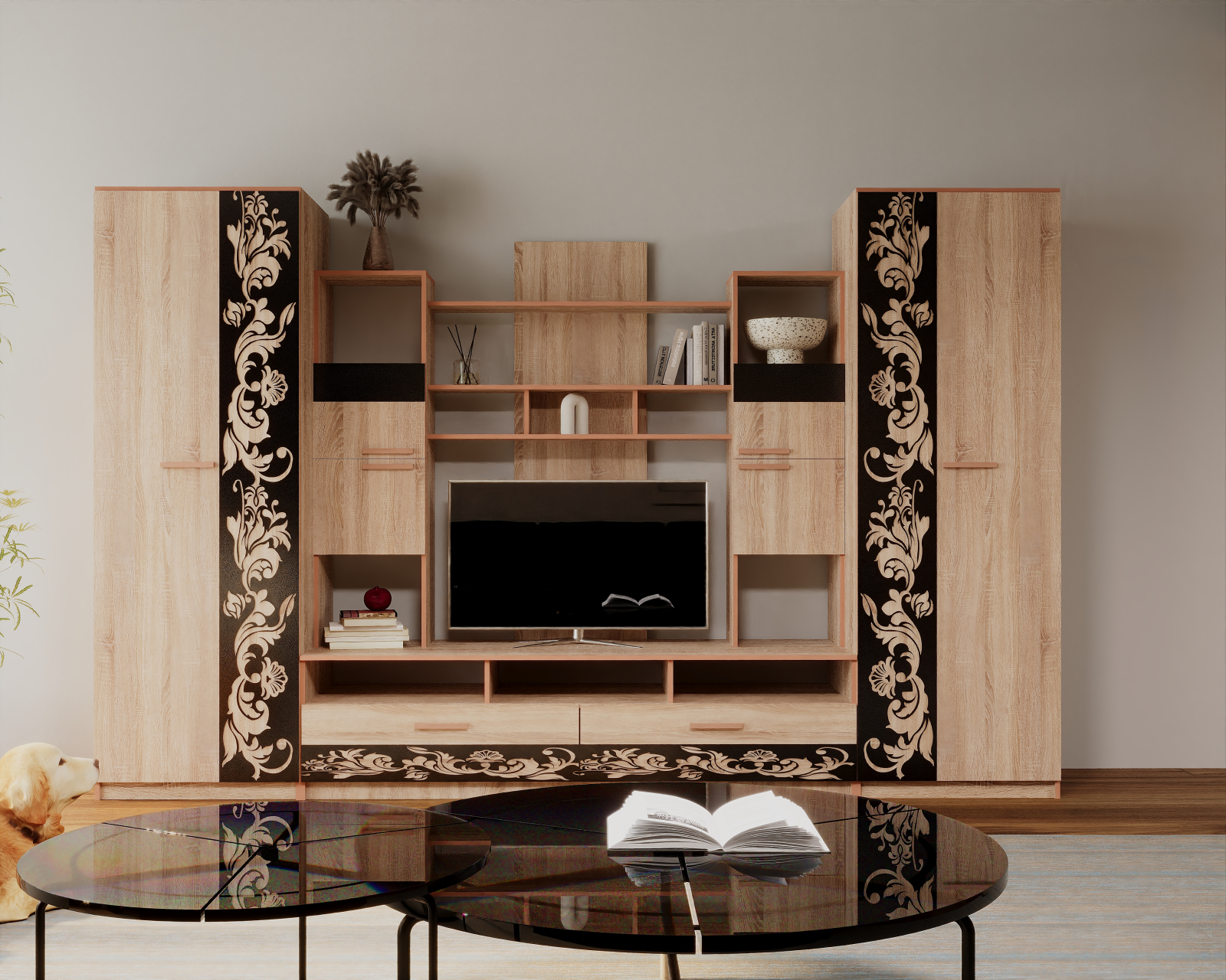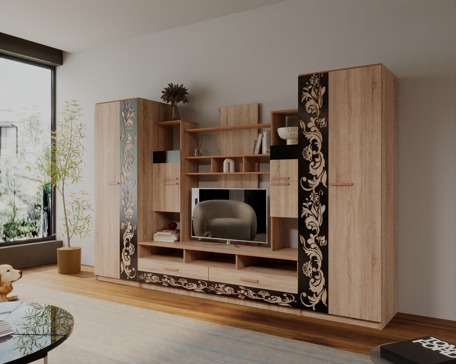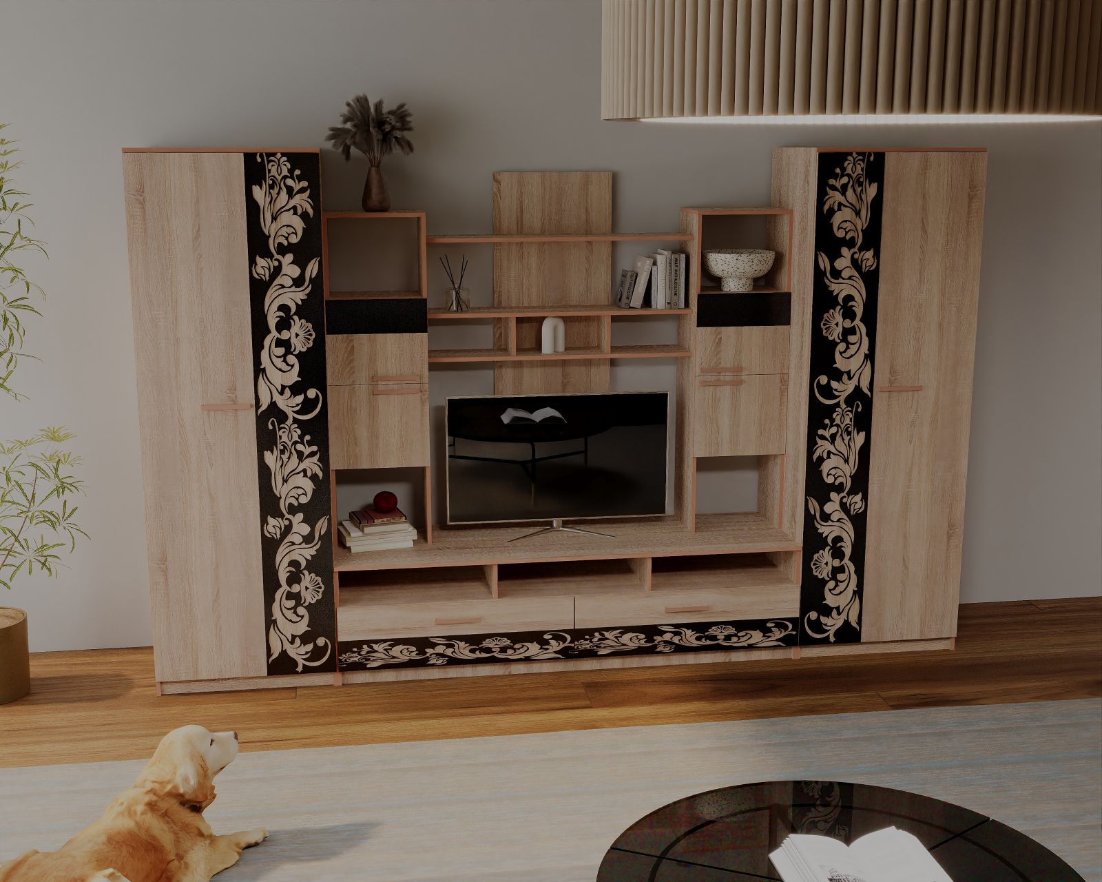 Set de mobilă pentru living, cu design modern și structură practică,realizat din PAL melaminat. Oferă spațiu generos de depozitare și o zonă TV bine definită, fiind ușor de integrat în orice living.