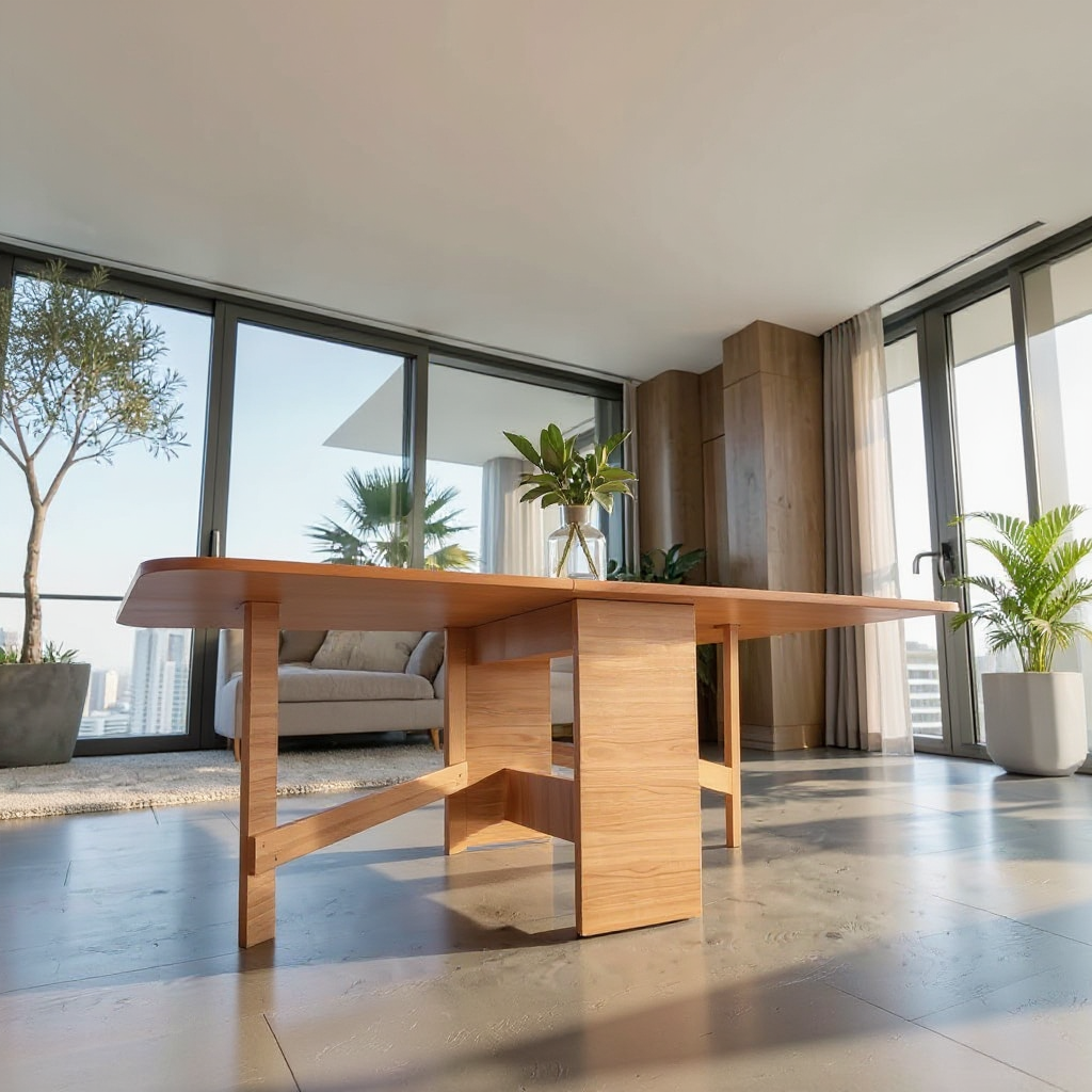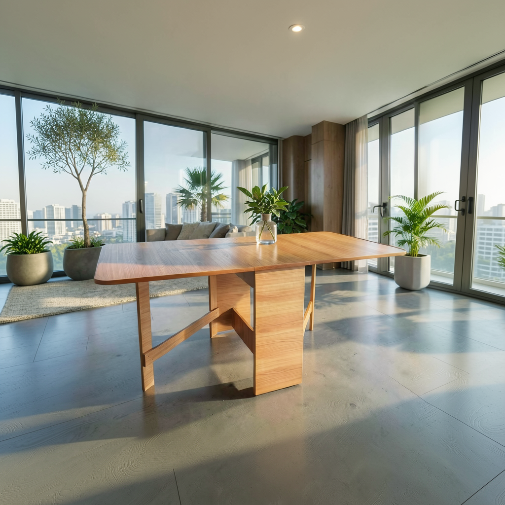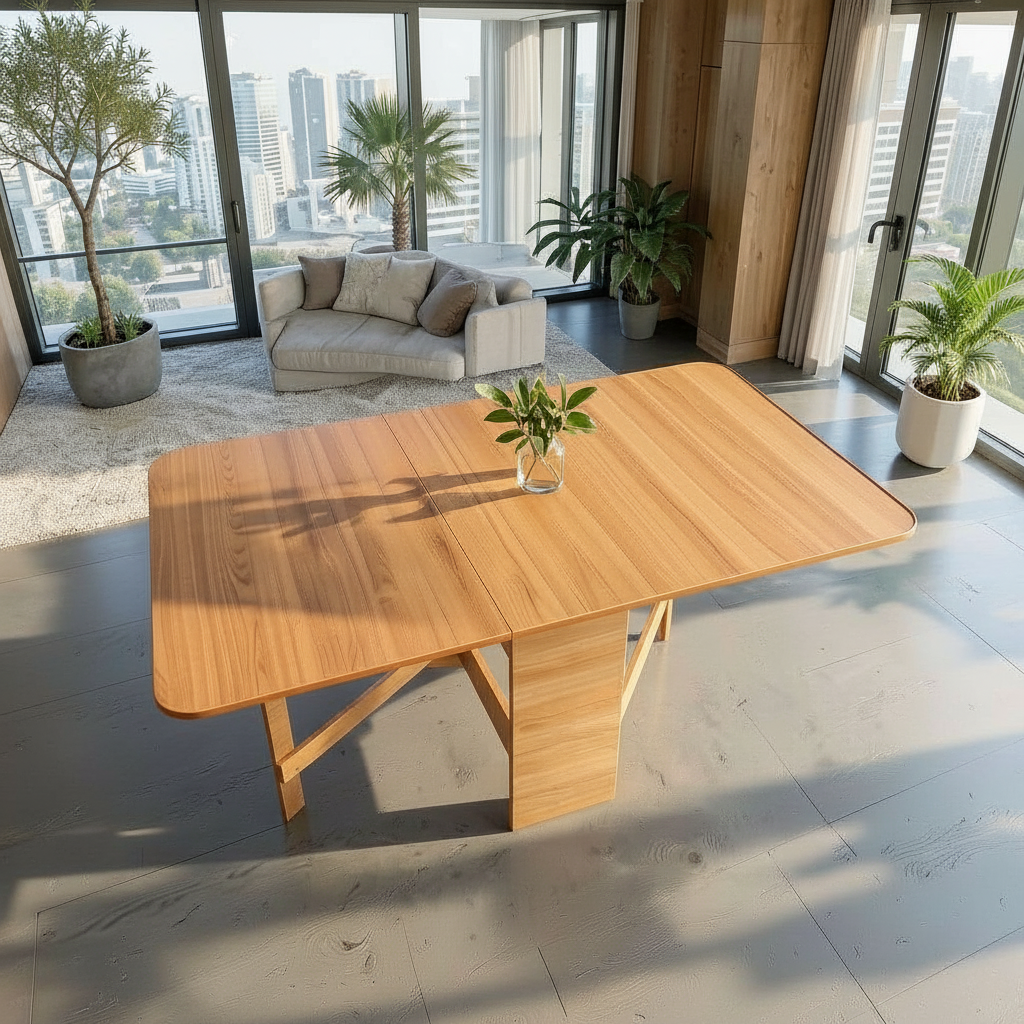 Masă pliantă cu design contemporan, practică și versatilă, realizată din pal melaminat, ideală pentru bucătărie sau living. Dimensiunea mesei poate fi ajustată cu ușurință prin ridicarea uneia sau a ambelor părți laterale, în funcție de necesități, acestea fiind susținute de un cadru din pal prevăzut cu balamale pentru o manevrare facilă.
