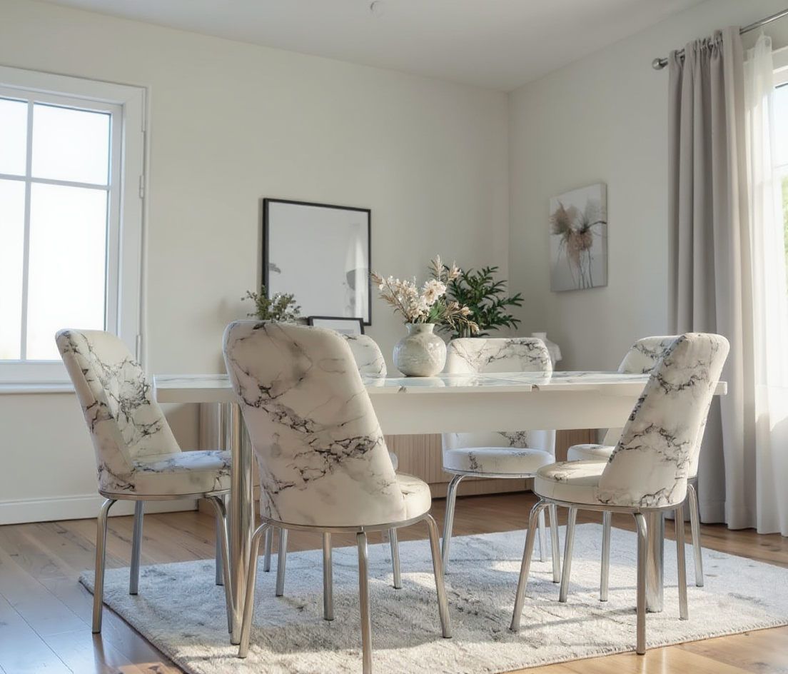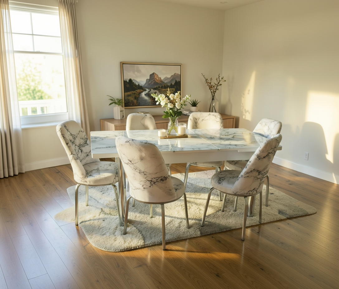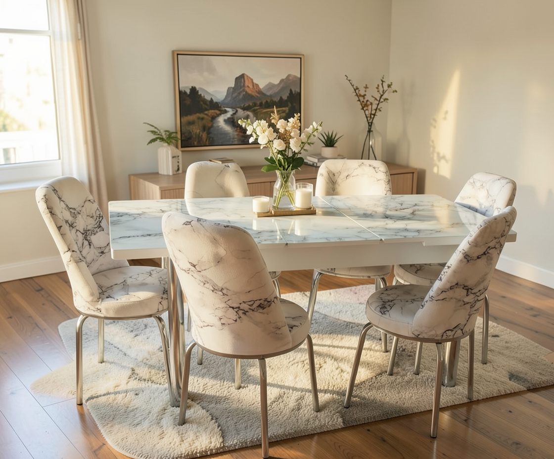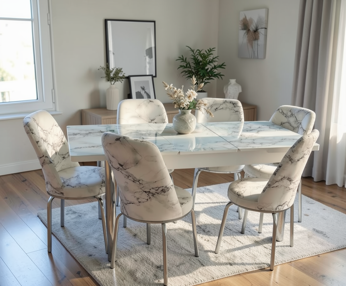 Set masă cu 6 scaune AYK 1, cu design modern, realizat din materiale rezistente, potrivit pentru dining sau living. Masa extensibilă oferă stabilitate și spațiu suplimentar la nevoie.