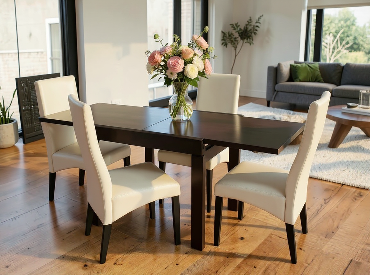 Set masă KORS cu 4 scaune 6012 Wenge / Crem, ideal pentru bucătărie, cu design practic. Masa extensibilă oferă flexibilitate și stabilitate, iar scaunele asigură confort în utilizare zilnică.