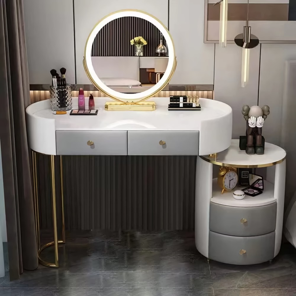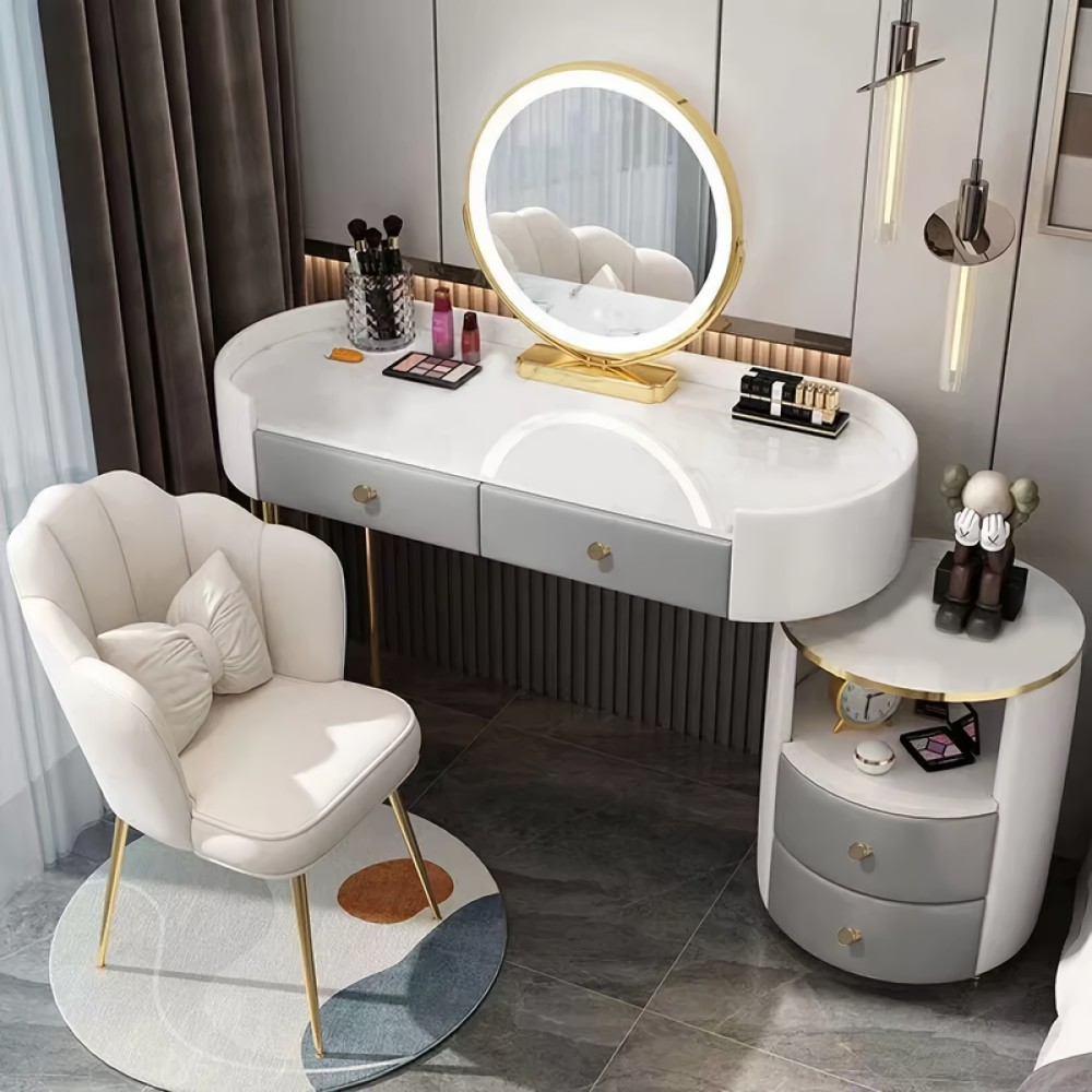 ● Această masă de toaletă are 2 sertare și un dulap de depozitare, oferind suficient spațiu pentru a vă ajuta să vă puneți toate produsele de îngrijire a pielii; cosmeticele, bijuterii, uscător de păr, ondulator și alte articole de înfrumusețare. Unul dintre sertarele mari are compartimente suplimentare care pot fi împărțite pentru depozitarea bijuteriilor.