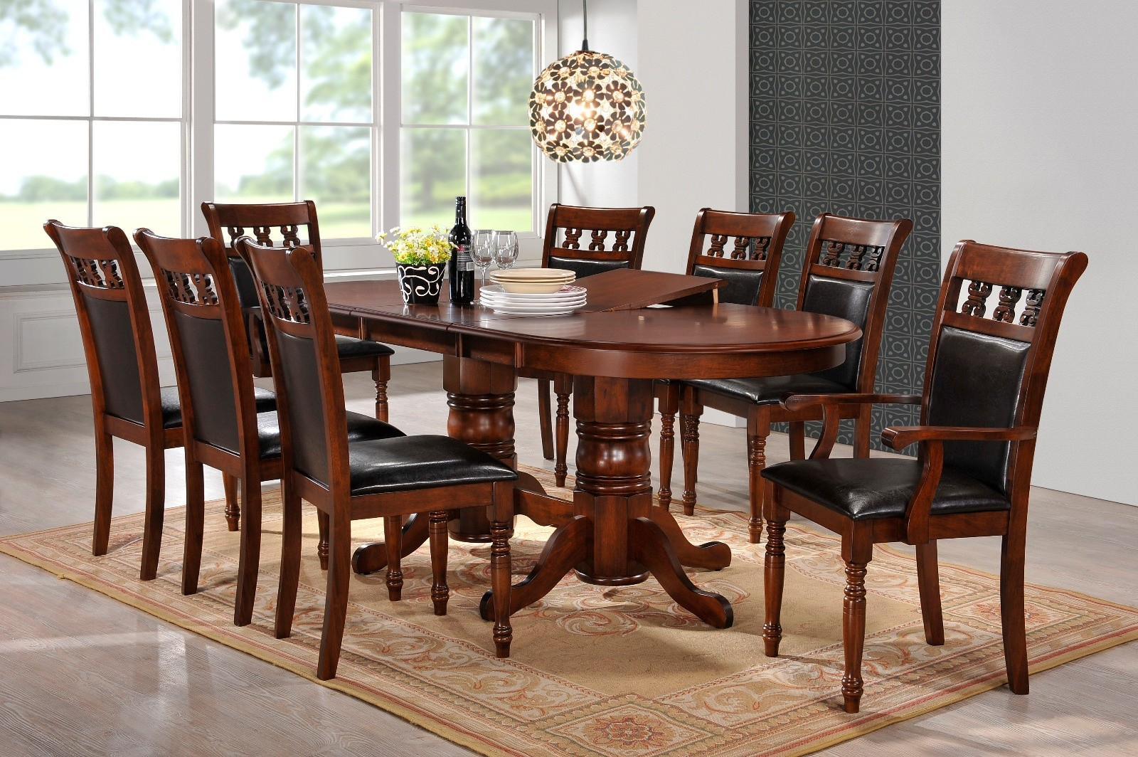 Set format din masa de lemn si 8 scaune tapitate, ideal pentru livingul sau bucataria dumneavoastra. Datorita materialului din care este confectionat, este o investitie de durata, avand rezistenta in timp. Cu un design ce nu se demodeaza usor, lemnul de culoarea nucului, se integreaza usor in ambientul casei dumneavoastra. Scaunele sunt capitonate cu burete pe sezut si apoi tapitate cu stofa rezistenta in timp.
